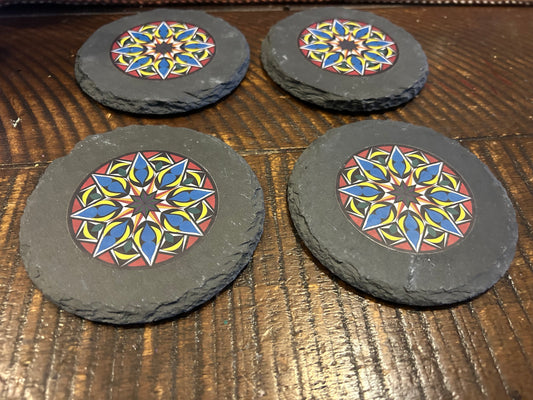 Hex signs are a Pennsylvania Dutch folk art tradition. The signs, typically hung on barns use symbols and colors meant to bring good fortune to the owner. Traditionally based on the stars most incorporate star patterns using the 4 or 12 point star to represent either the four seasons or the calendar year.